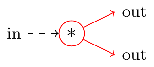 \mathcal{X}(S) = S^2 + S^0 = S^2 + 1. Pictured below is a directed multigraph with four edges and four vertices, providing an example of a coalgebra S \to \mathcal{X}(S). In this case the set S has ten elements, four of which are assigned the edge co-operation, each thus outputting two elements, and six of which are assigned the vertex co-operation, each thus outputting no elements.
