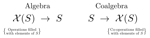 Given a \mathbf{Set}-set \mathcal{X}, an algebra is a map \mathcal{X}(S) \to S (assigning to each operation filled with elements a unique element). A coalgebra is a map S \to \mathcal{X}(S) (assigning to each element a unique co-operation filled with elements). In the context of an algebra, the elements that fill the expressions act as inputs, whereas in the context of a coalgebra, the elements that fill the expressions act as outputs.